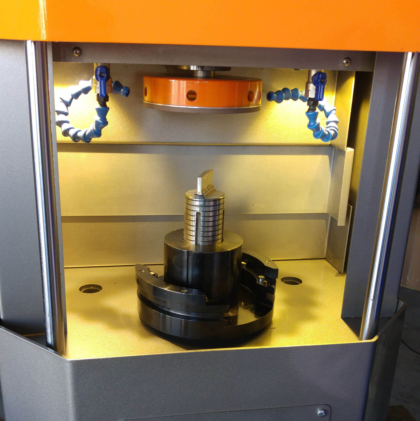 Makine ve ekipman sektöründe 20 yılı aşkın deneyimin ardından KSP Makine, yüksek hassasiyetli Punch Takım Taşlama Makinesini geliştirmiştir. Taşlama işlemi, soğutma sistemine sahip özel bir taşlama diski ile yapılır. Bu sistem, taşlama kalitesini artırırken parçaların aşırı ısınarak zarar görmesini önler. Tüm standart punch takımları için gerekli sabitleme aparatları makine ile birlikte sunularak kullanıcıya eksiksiz bir çözüm sağlanır.