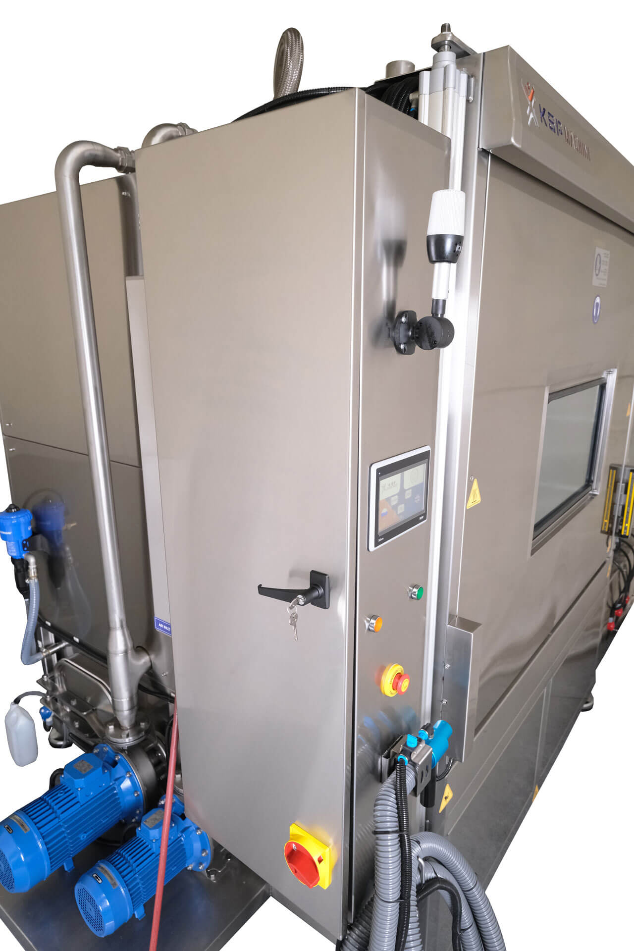 Döner sepet üzerine yerleştirilen ürünler, kapalı bir kabin içerisinde yüksek basınçlı ve deterjanlı suyla temizlenir. İhtiyaca göre yıkama, durulama, kurutma üniteleri ve hassas filtrasyon gibi ek proseslerle desteklenerek temizlik kalitesi artırılabilir.